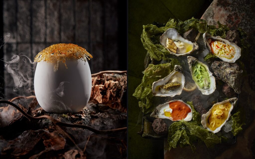 Destaca el capítulo de raw bar –los crudos tienen un gran protagonismo–, con ostras Guillardeau n.o 3 (al natural o con diferentes aliños: leche de tigre con corazones de palma, mignonette de fruta de la pasión…), carpaccios (como el de pulpo con ensalada griega de berenjena y queso feta) y varios ceviches en sabrosas preparaciones, corvina en adobo rojo o langostinos en aguachile de coco, cilantro y lima. Perfectos para compartir al centro son los mejillones al huacatay o el dip de semillas de calabaza. Cuenta también con sugerentes ensaladas y verduras (como la lechuga a la brasa con pipián de menta o los cogollos con melocotón), un par de arroces cambiantes (por ejemplo, con jarrete de cordero y huitlacoche), pescados a la brasa o a la sal con mojo verde, un soberbio steak tartar de solomillo de vaca rubia (con crema al ají y chips de tupinambo), costillas (de ternera a baja temperatura o de cerdo ibérico crujientes) y tuétano a la brasa con carabinero.