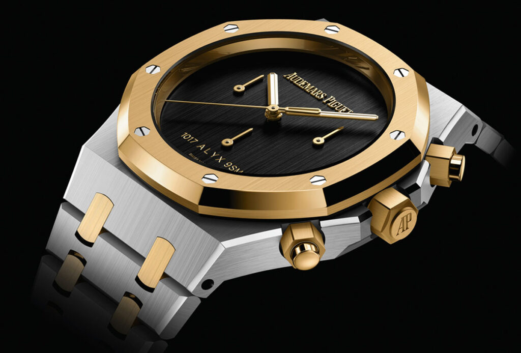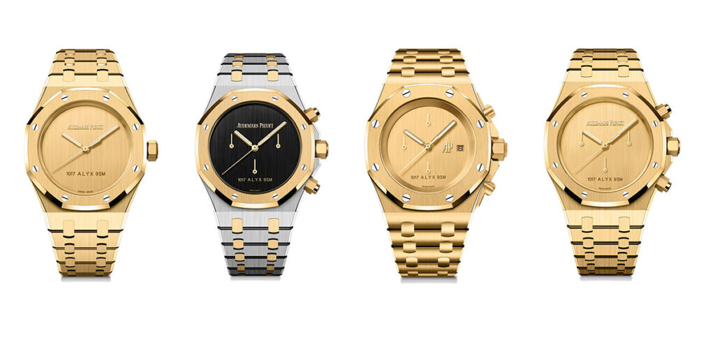 Los dos modelos Royal Oak se fabrican íntegramente en oro amarillo de 18 quilates. El primero es un modelo de carga automática de 37 mm con indicación de horas, minutos y segundos, ideal para las muñecas más pequeñas. La esfera minimalista incorpora agujas de oro amarillo luminiscentes y las firmas «Audemars Piguet» y «1017 ALYX 9SM», la primera aplicada en oro y la segunda transferida. El segundo es un cronógrafo automático de 41 mm que hace gala de un minimalismo extremo en la esfera, hasta el punto de eliminar los contadores de cronógrafo y dejar tan solo las agujas girando a las 3, las 6 y las 9 horas. Estas dos Referencias Royal Oak se producen en series limitadas.