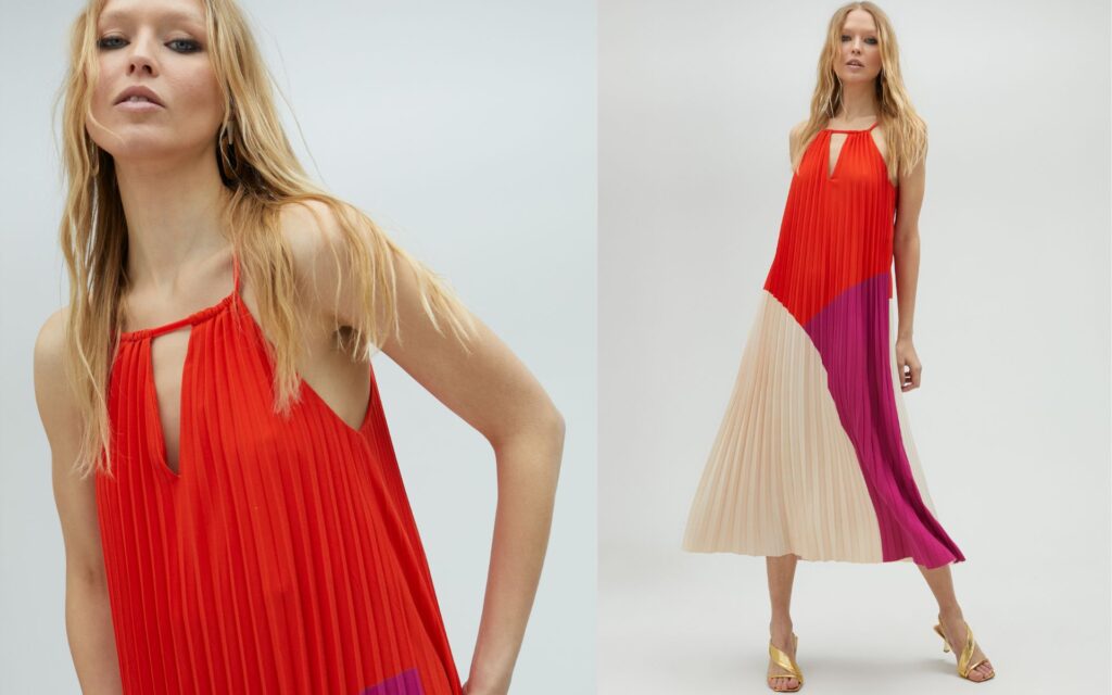 Otras opciones a destacar son las camisetas, tops de punto y chaquetas cortas adornadas con strass y paillettes, además de una falda y un vestido midi plisado en tonos marrones, naranjas y fucsias que incorporan un efecto vaporoso a la colección.