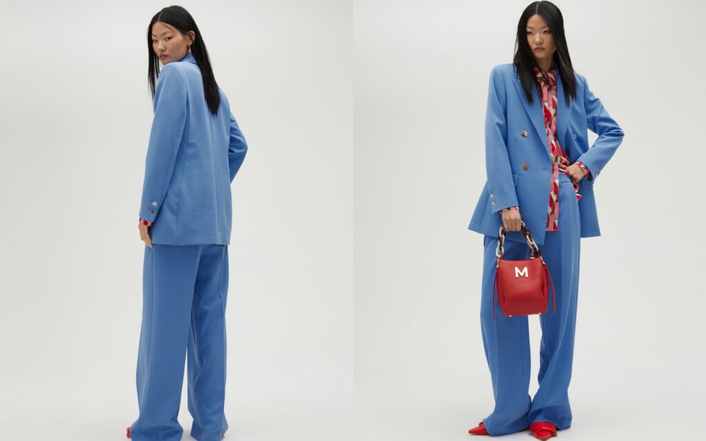 Como pieza clave, el traje de blazer entallada y pantalón palazzo en azul se convierte en un básico esencial para esta cápsula, especialmente al combinarse con las prendas en logomanía geométrica que encontramos en tops, joggers y camisas.
