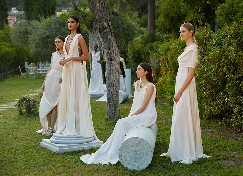 Estas preciosas creaciones que conforman la nueva colección de alta joyería de Dior, dan una tercera dimensión al poder de los estampados y los patrones, revelándose junto a las siluetas de alta costura imaginadas por Maria Grazia Chiuri a través de una onírica doble puesta en escena. Durante el cóctel, unos animados cuadros inspirados en la antigüedad resaltaron los largos vestidos blancos que reinventan la técnica del peplum.