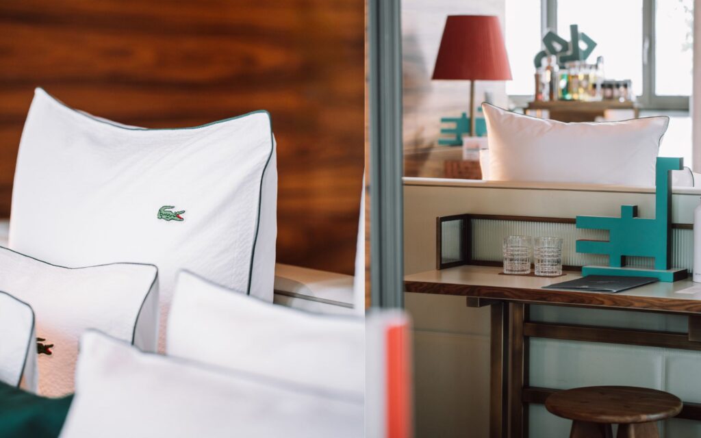 Cada detalle, desde la decoración hasta la ropa de cama, refleja la estética atemporal de Lacoste. Creando un entorno único donde se unen el lujo y el deporte.