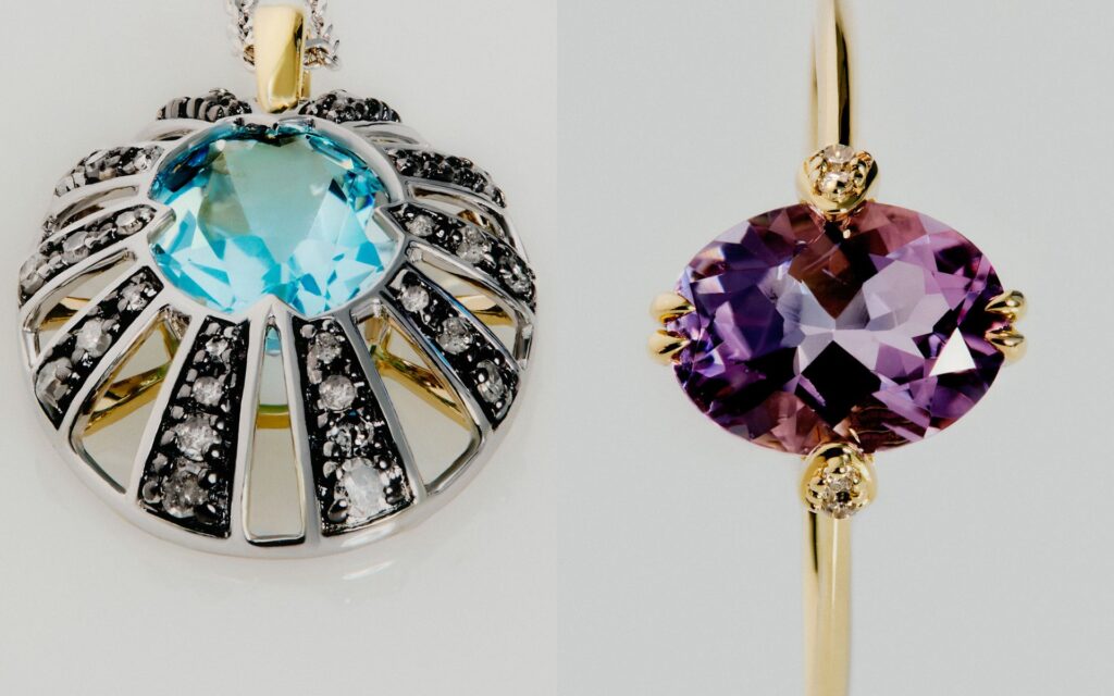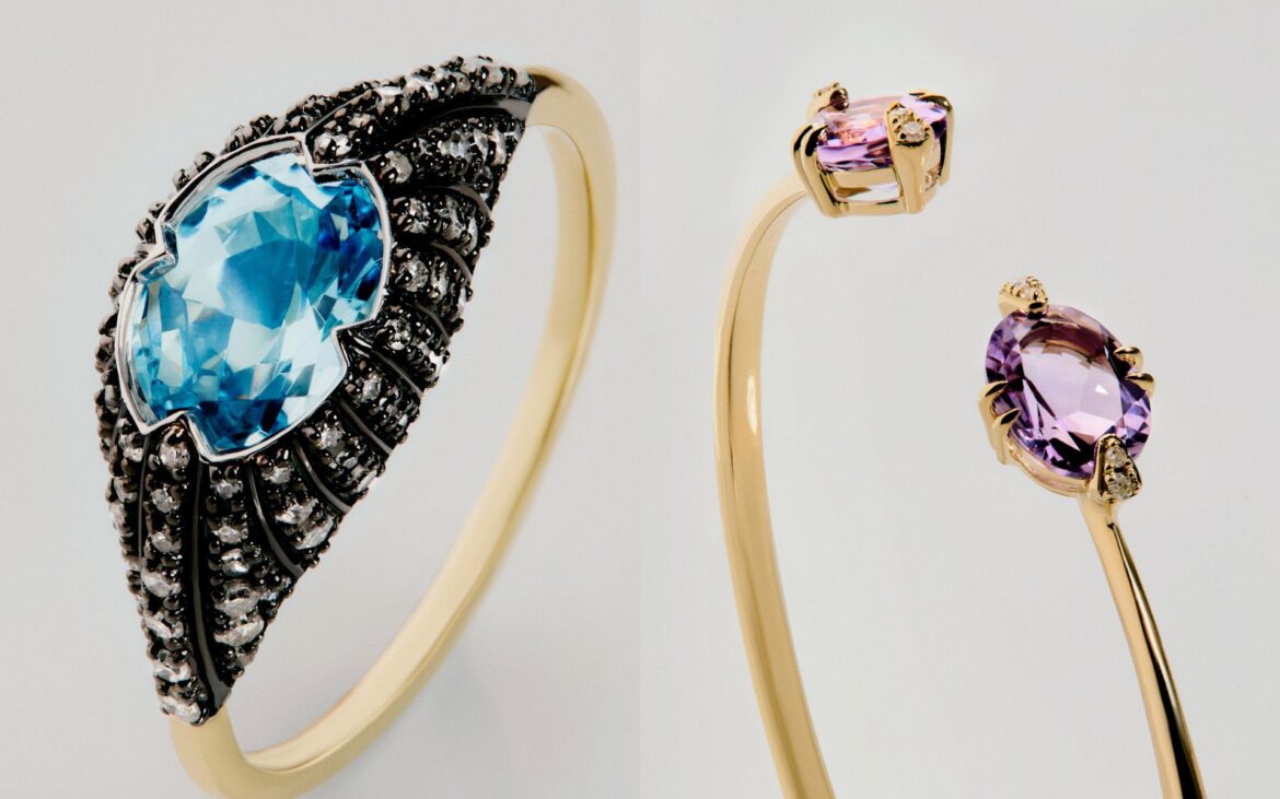 En el segundo y tercer conjunto de joyas, el fulgor característico de los diamantes single cut aparece en las garras de los engastes y rodeando en pavé otras piedras preciosas centrales en talla oval, como el topacio azul sky o la amatista rosa peach. Los dos últimos conjuntos aparece también el oro amarillo, tanto en la montura completa de la joya como en combinación con oro blanco, creando así un contraste único y aportando un extra de personalidad a la colección.
