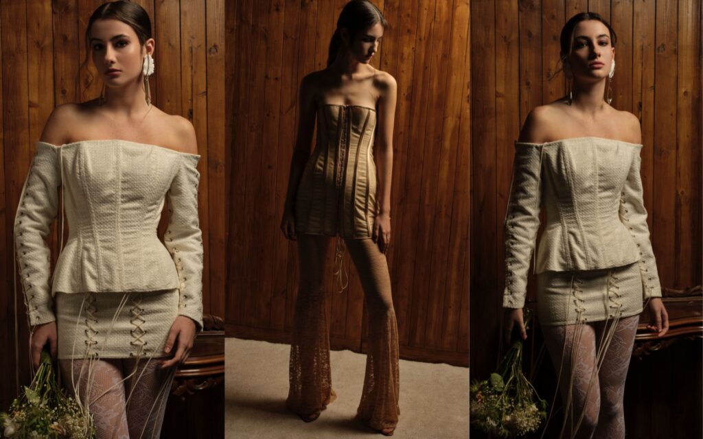 Por su parte, Serrastudio, una firma que encarna la fusión perfecta entre tradición y modernidad, lleva el corset a una dimensión artística. Sus propuestas destacan por cortes innovadores, materiales inesperados y una estética audaz que desafía los límites entre la moda y la arquitectura textil. Desde versiones en cuero con detalles metálicos hasta reinterpretaciones en denim, cada pieza de Serrastudio redefine el concepto de empoderamiento a través de la moda.